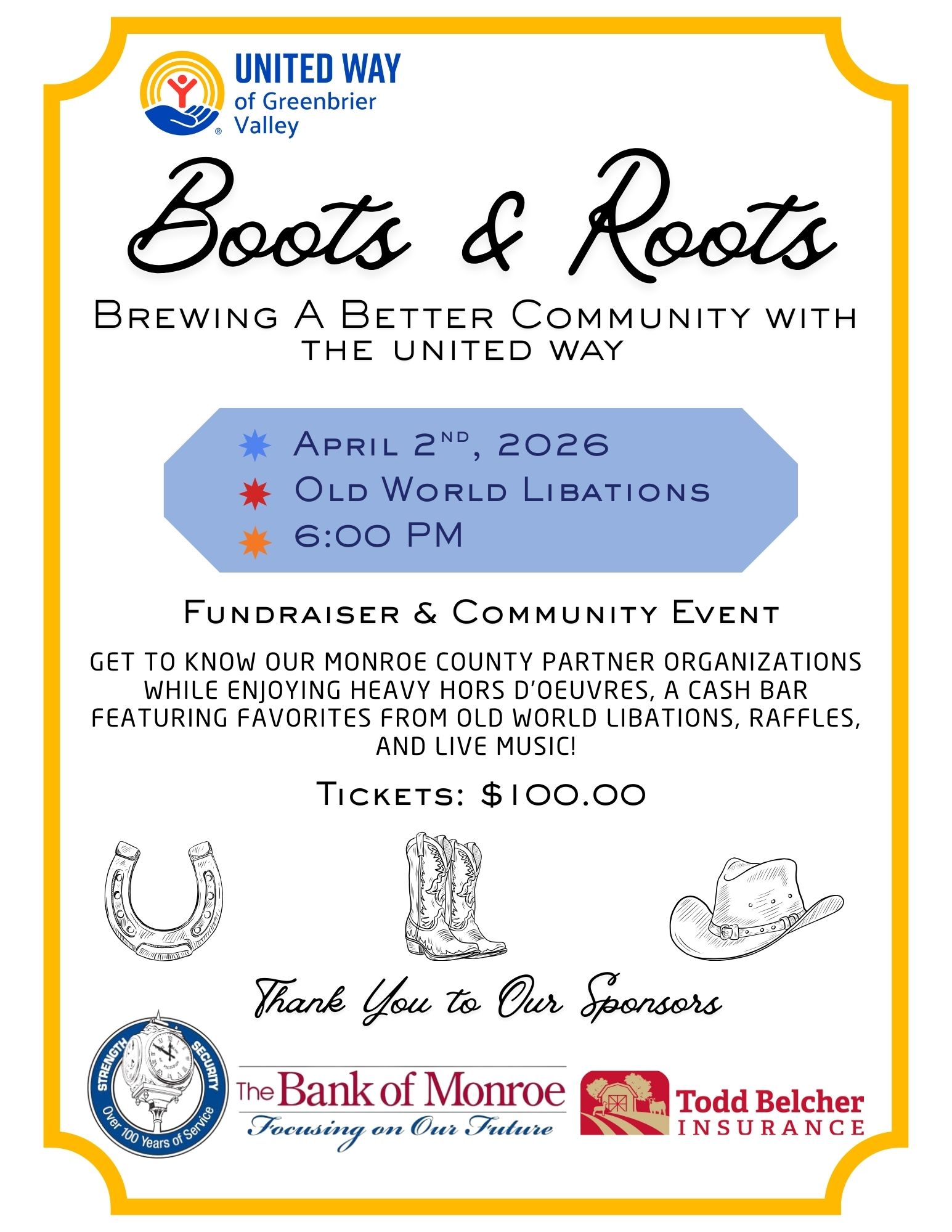 Join The United Way of Greenbrier Valley for a western-themed evening where you can meet and mingle with our incredible Monroe County partner organizations. Enjoy heavy hors d’oeuvres, a cash bar featuring favorites from Old World Libations, exciting raffles, and live music throughout the night. Dust off your boots, throw on your best western attire, and come celebrate the organizations that make a difference right here in our community! Tickets are limited! Be sure to purchase today.